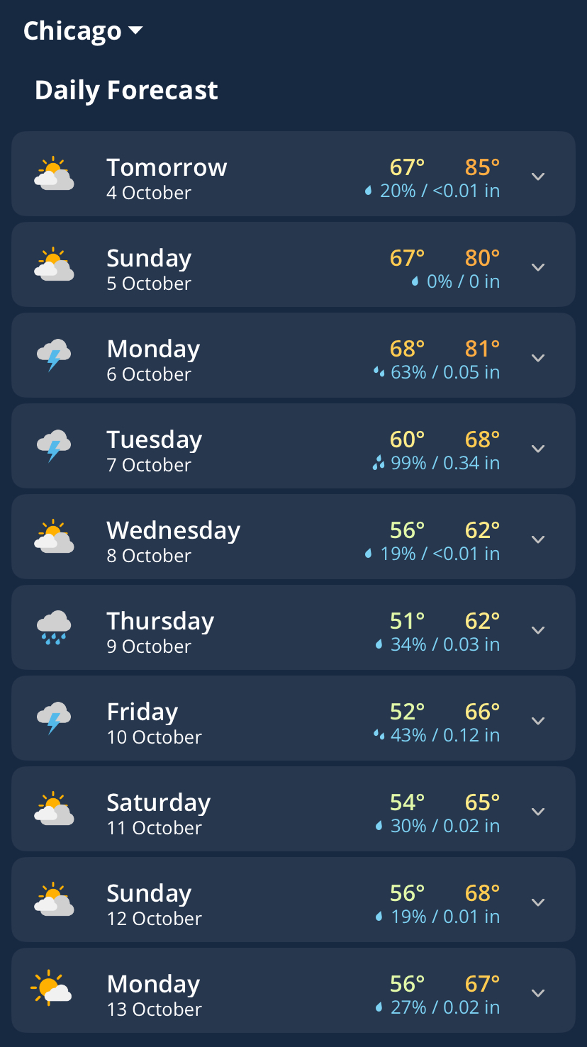 Image: Daily forecasts for Chicago, Il on the Weatherzone app, showing variable temperatures over the next 10 days.