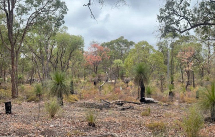 In the image, the smallish red tree on the left of the picture is a relative young Jarrah tree that just died from lack of water. Holbeach says many trees are dying.