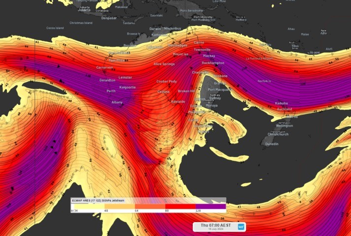 Image: ECMWF forecast model showing the jet streams flowing over Australia at the 300hPa level on Thursday, July 18.