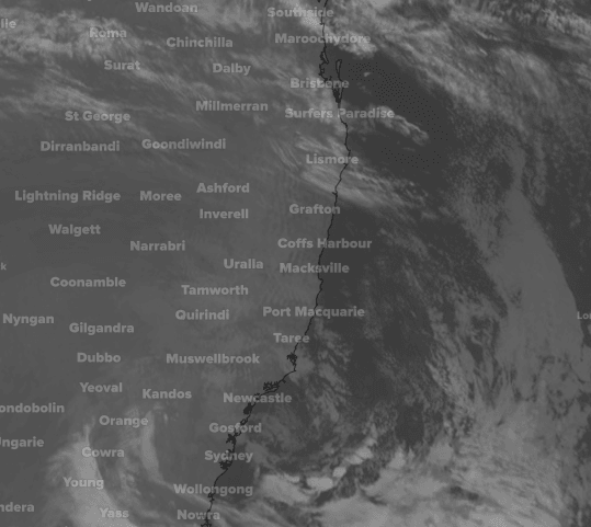 Image: Infrared satellite (Himawari-8) imagery showing relatively clear skies over Sydney and Brisbane on Friday morning