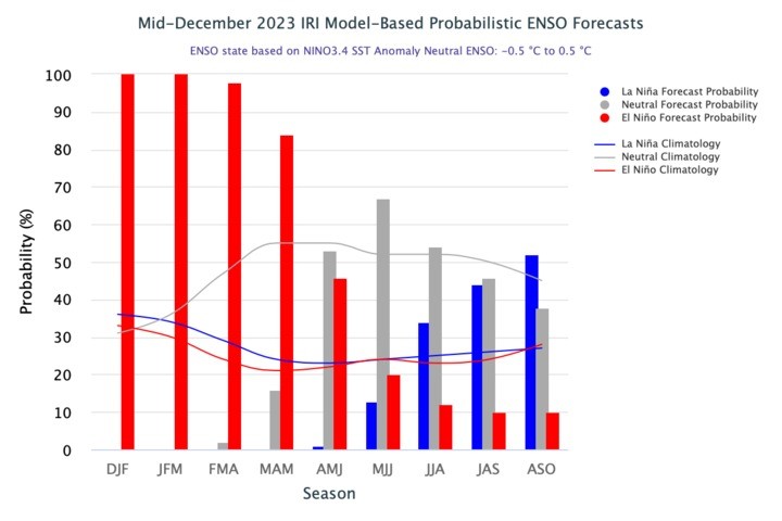 IRI Model-based probabilistic ENSO forecasts published December 19th 2023. Source: iri.columbia.edu