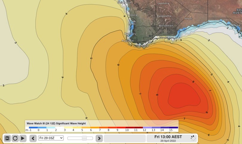 Wave Watch III model output showing the large swell clipping southern WA on Friday 29th.
