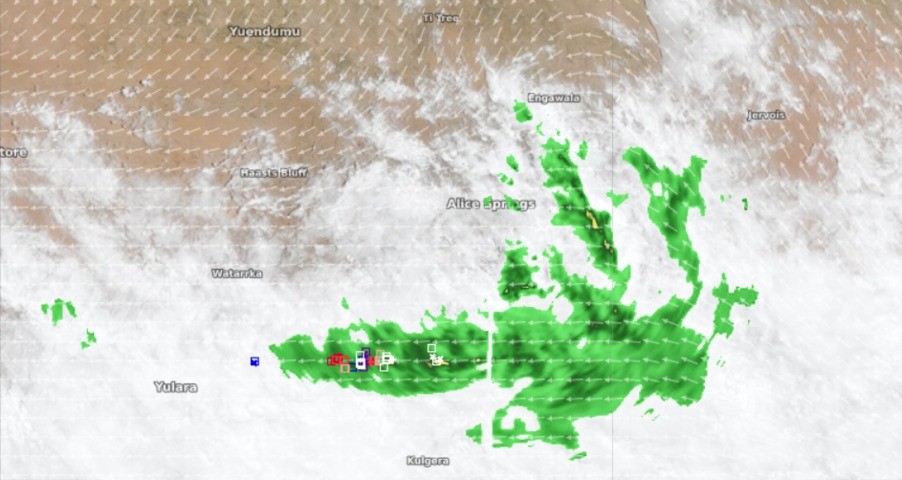 But yesterday, the dense clouds associated with an inland trough, brought some storms into Australia’s centre. This trough was fuelled by tropical moisture brought over from the Indian Ocean and resulted in 11mm of rain for Alice Springs by 9am on March 31stalong with around 240 lightning strikes across the area. Another 19.6mm fell in the 24 hours to 9am April 1st, including 8.2mm before midnight of March 31st.