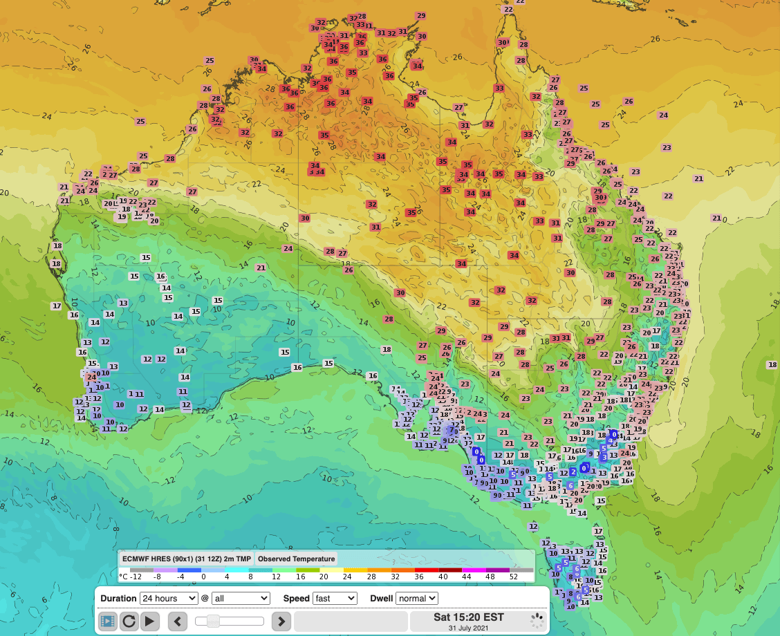 Image: ECMWF showing warm surface temperatures across the north and central east of Australia, along with observed temperatures on the afternoon of Saturday July 31st