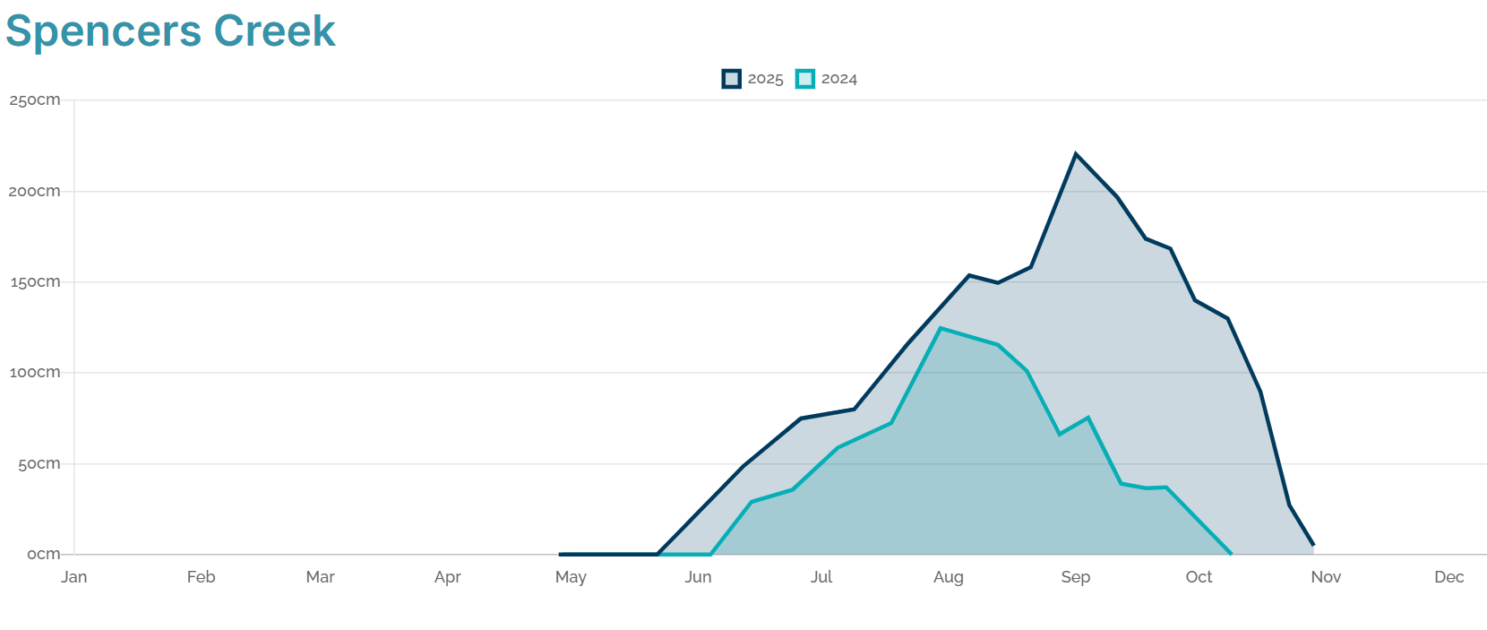Meanwhile the graph for Spencers Creek is just about locked in for season 2025, although it hasn’t quite hit rock bottom yet – with an average of 4.9cm on October 29. That measurement doesn’t include the deep ice walls on the fringe of the creek.