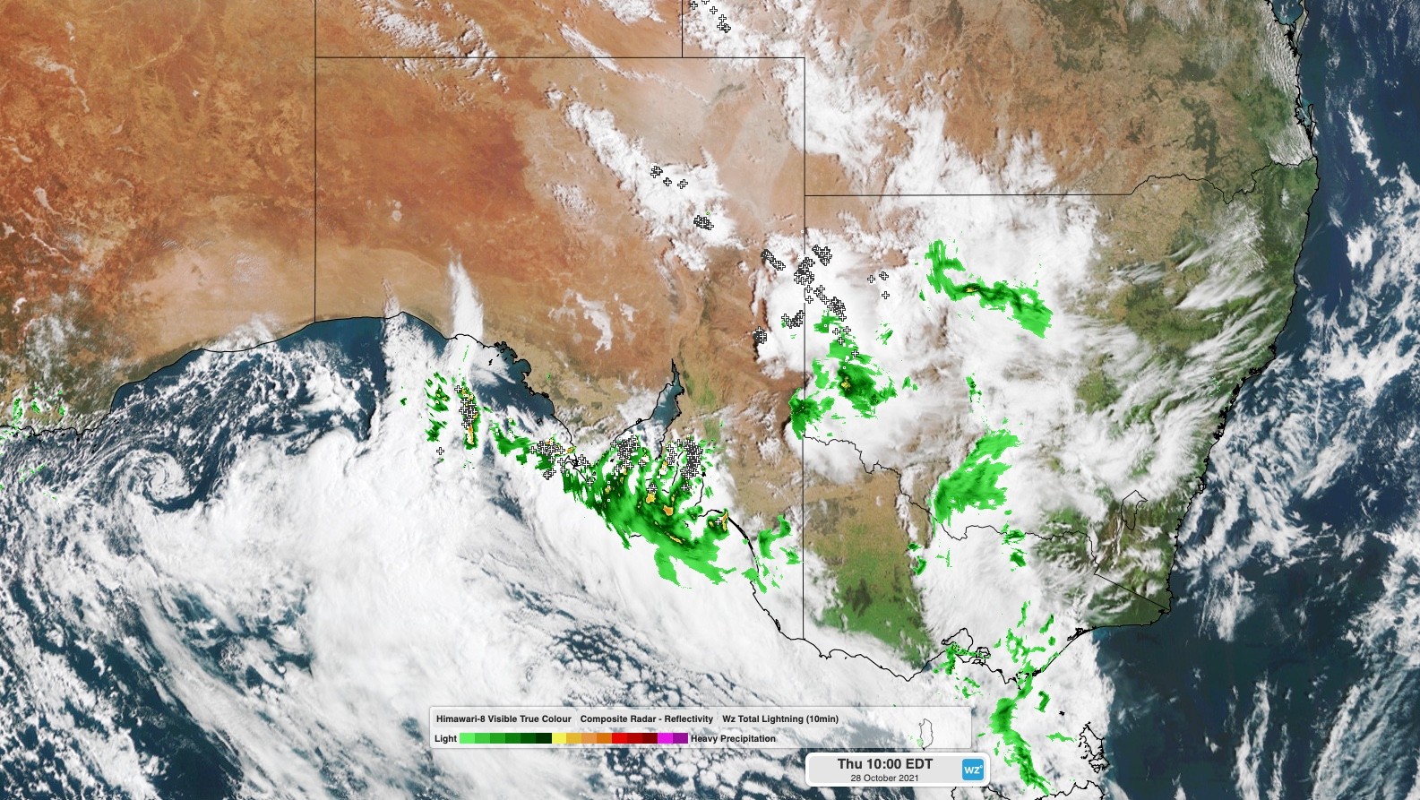 Image: Composite satellite, radar and lightning strikes at 10am AEDT on Thursday.