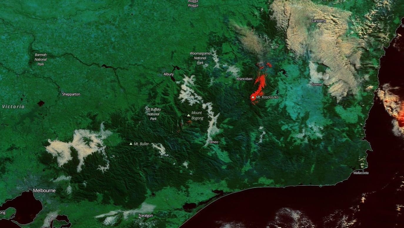 Image: False-colour satellite image showing snow-cover (red) in Australia's alps on June 29th. Source: NASA Worldview.