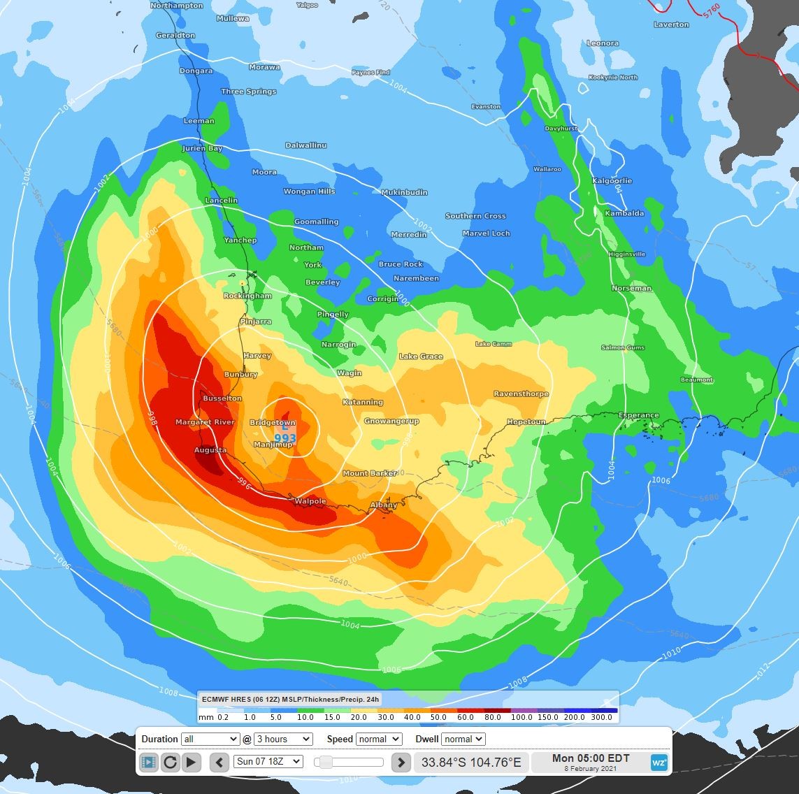 Image: Location of the low at 2am AWST Monday and 24 hour rainfall according to the ECMWF HRES model.