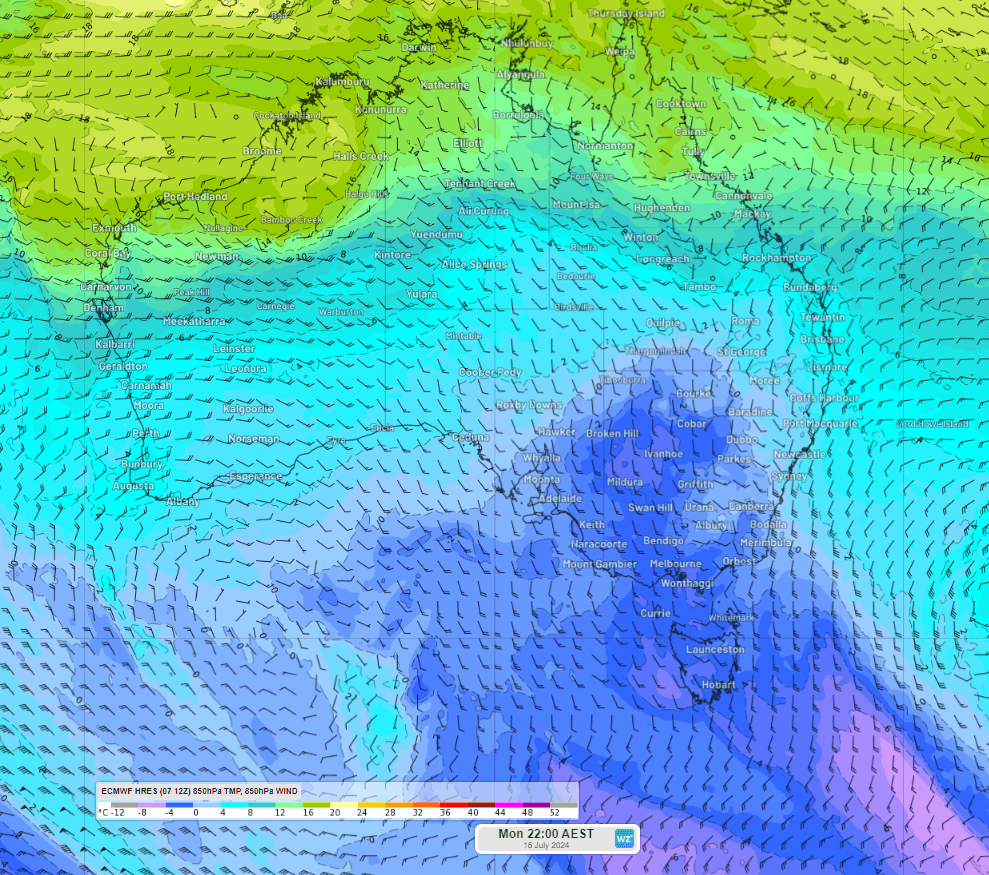 Image: 850 hPa (around 1.5km above the surface) temperature and wind forecast at 10pm AEST on Monday, July 15