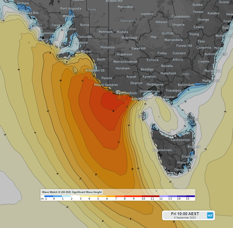 Image: Significant wave heights off southwest VIC at 10am Fri 8th via WaveWatch