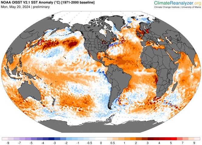 Image: Global sea surface temperature anomaly on May 20, 2024, according to the OISST V2.1 dataset. Source: ClimateReanalyzer.org