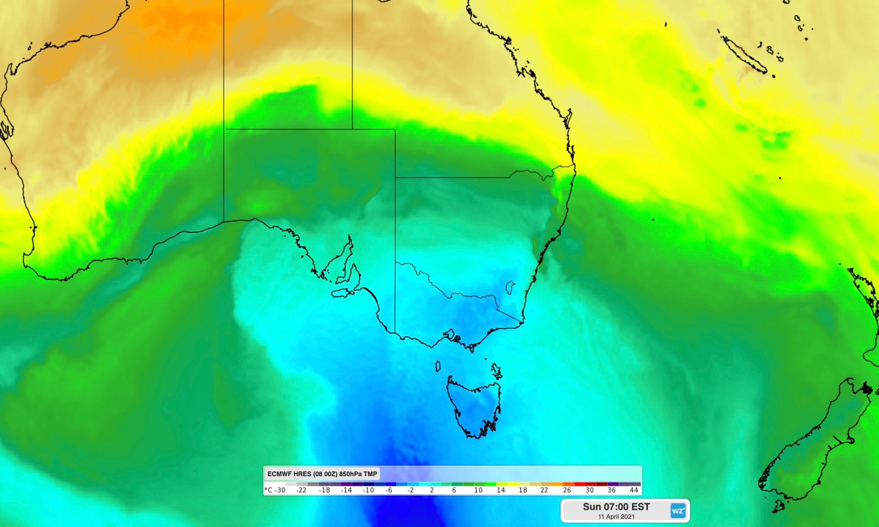 Image: Cold air over southeastern Australia on Sunday in the wake of two cold fronts.
