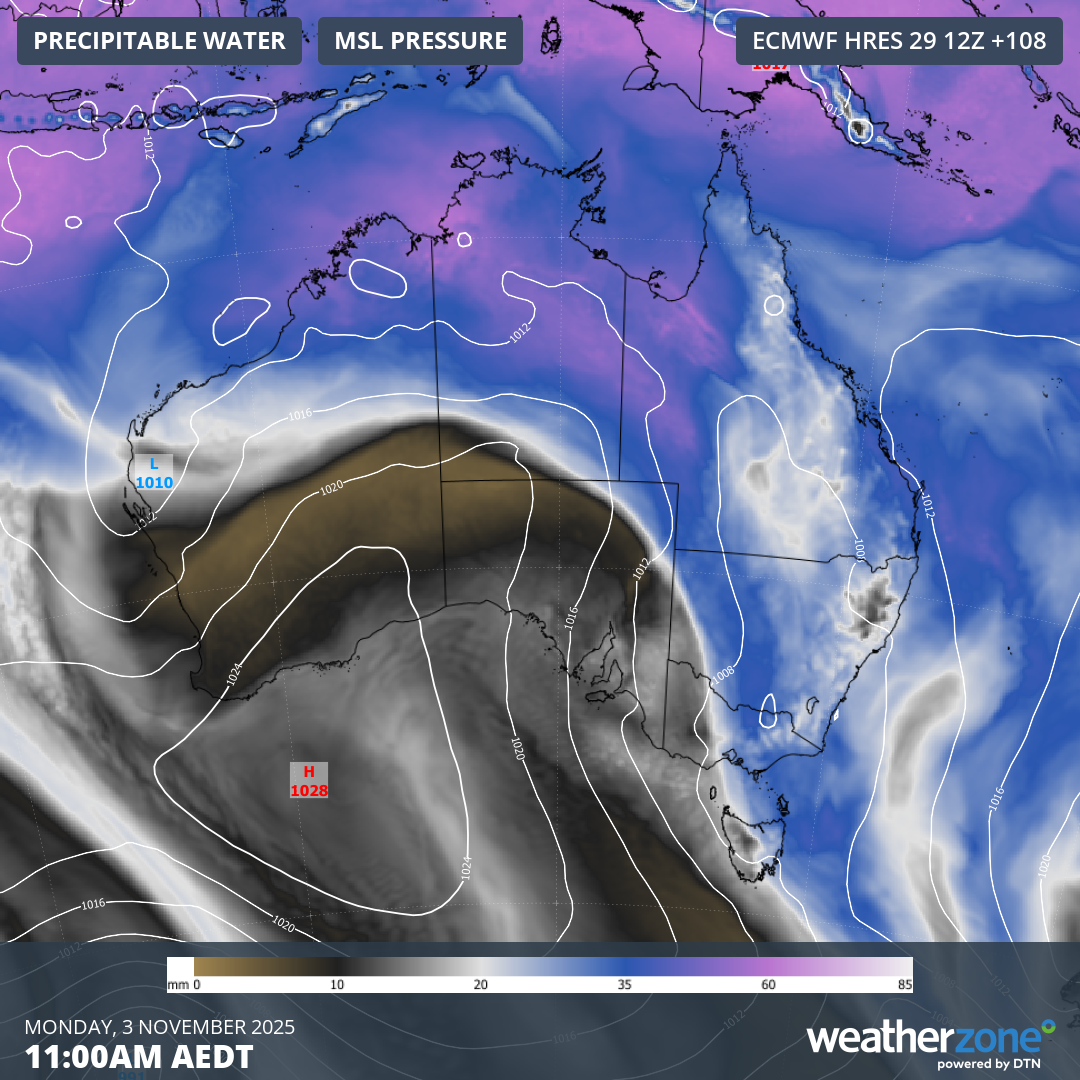 Image: Available water vapour that could convert to precipitation across Australia according to the ECMWF model for Monday, November 3, 2025.