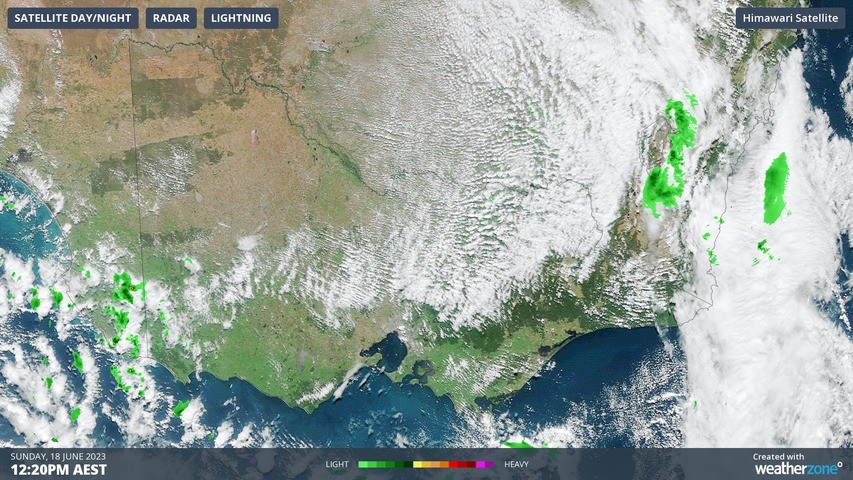 Image: Himawari-9 visible satellite imagery and BoM radar at 12pm Sun 18th
