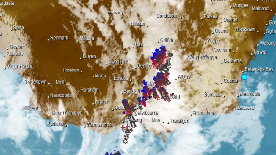 The rain band with embedded lightning strikes crossing eastern Australia just before 2 pm on Friday.
