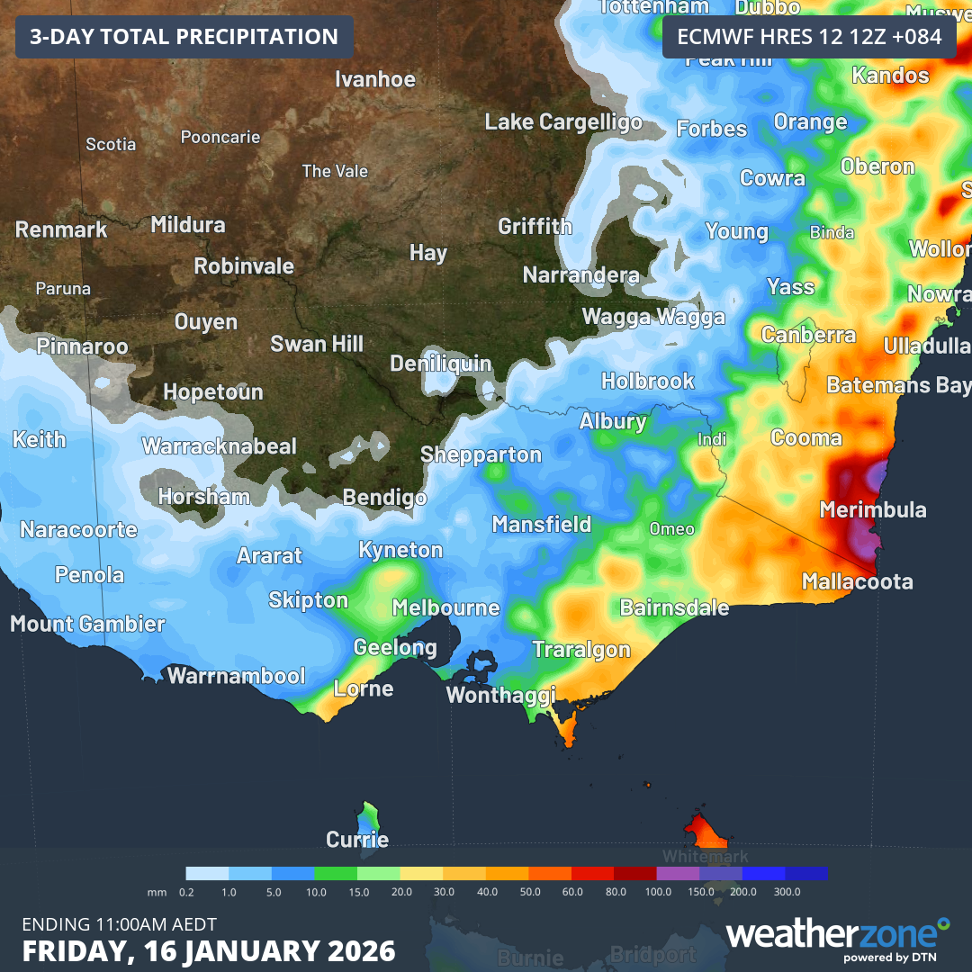 Image: Rain forecast map for Victoria for the three days up until the morning of Friday, January 16, according to the ECMWF model.
