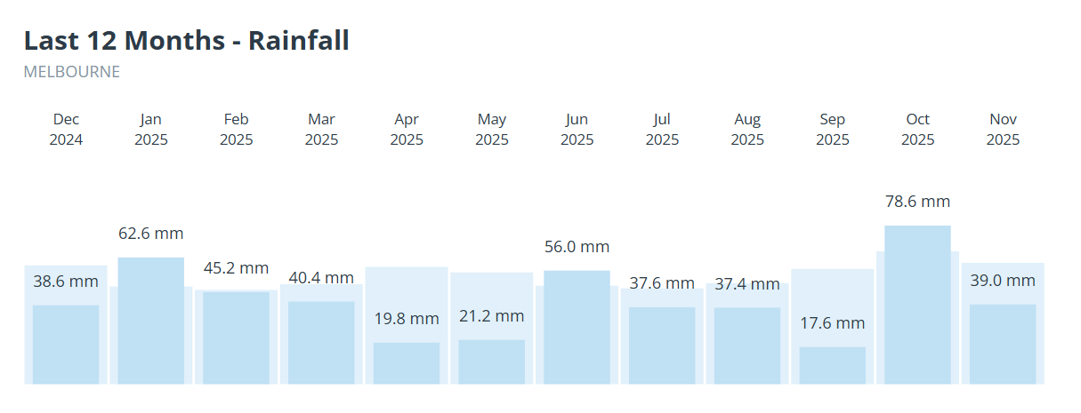 Rain fell on four of the first five days of November 2025 in Melbourne, with 39mm accumulated to date, which is roughly two thirds of the monthly average of 59mm.
