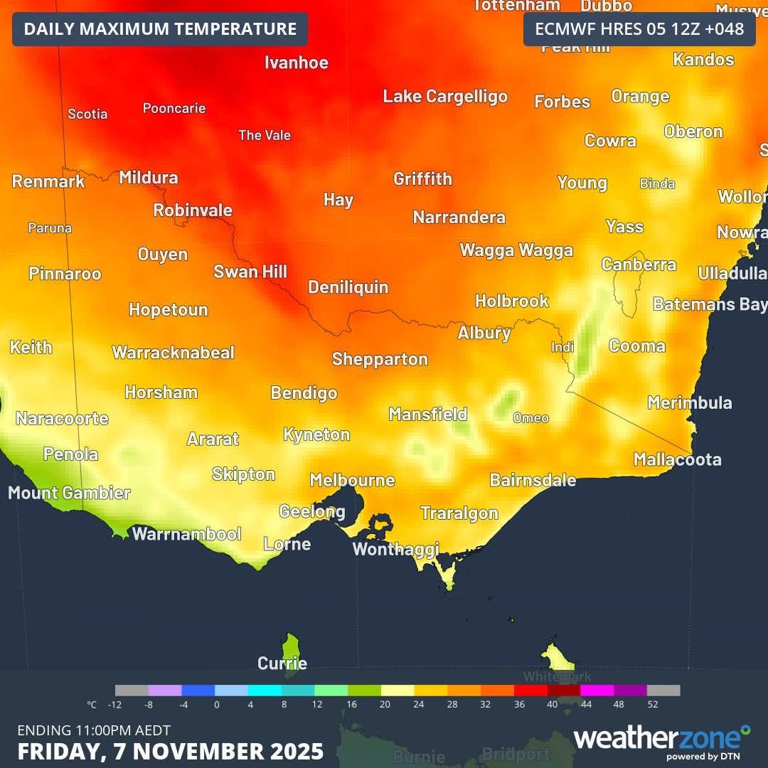 Image: Maximum temperatures across Victoria and adjacent areas according to the ECMWF model for Friday, November 7, 2025.