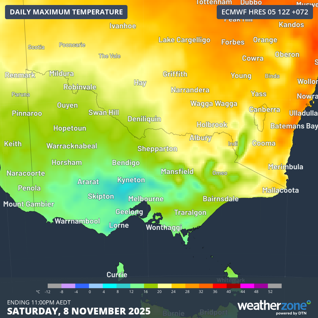 Image: Maximum temperatures across Victoria and adjacent areas according to the ECMWF model for Saturday, November 8, 2025.