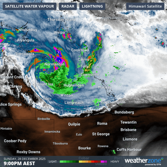 Image: 12-hour combined radar and water vapour loop showing the relentless influx of tropical moisture generating extremely heavy rain in two distinct parts of northern Qld from the evening of Sunday, December 28 to Monday morning, December 29, 2025.