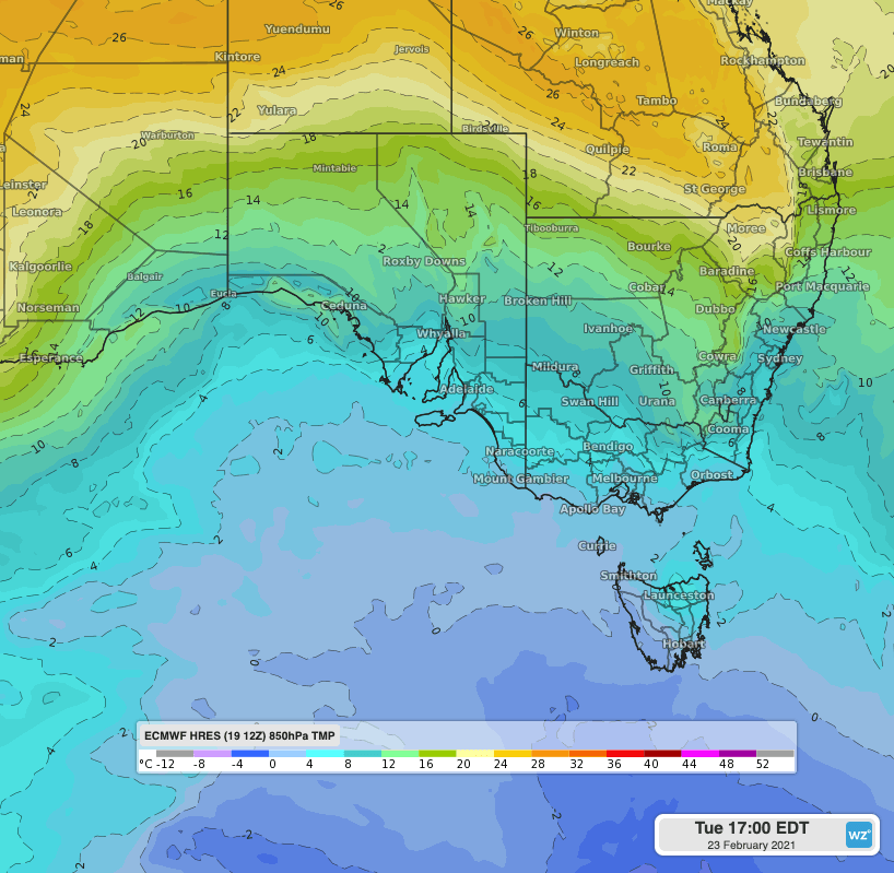 A front crossing the south during Sunday will bring a much cooler airmass that should linger until late next week. The mercury will stay 4-8 degrees below average in Adelaide and Melbourne between Sunday and Thursday, possibly extending into Friday in Melbourne, with April-like temperatures. Tuesday appears to be the coolest day, when the temperature may fail to reach 20 degrees in Melbourne.