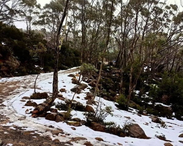 One Tassie local snapped a little snow on Monday morning on the dirt road up to Mt Mawson, about an hour-and-a-half from Hobart.