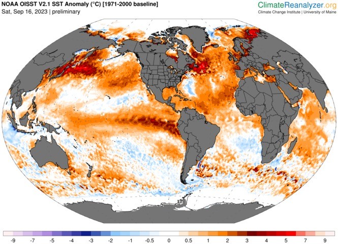According to NOAA’s ESSRTv5 dataset, the mean global ocean temperature rose by about 0.15ºC per decade between 2000 and 2022. This rapid warming means that a global ocean temperature anomaly of 0.5ºC in today’s climate is warmer, in absolute terms, than the same anomaly was 30 years ago.