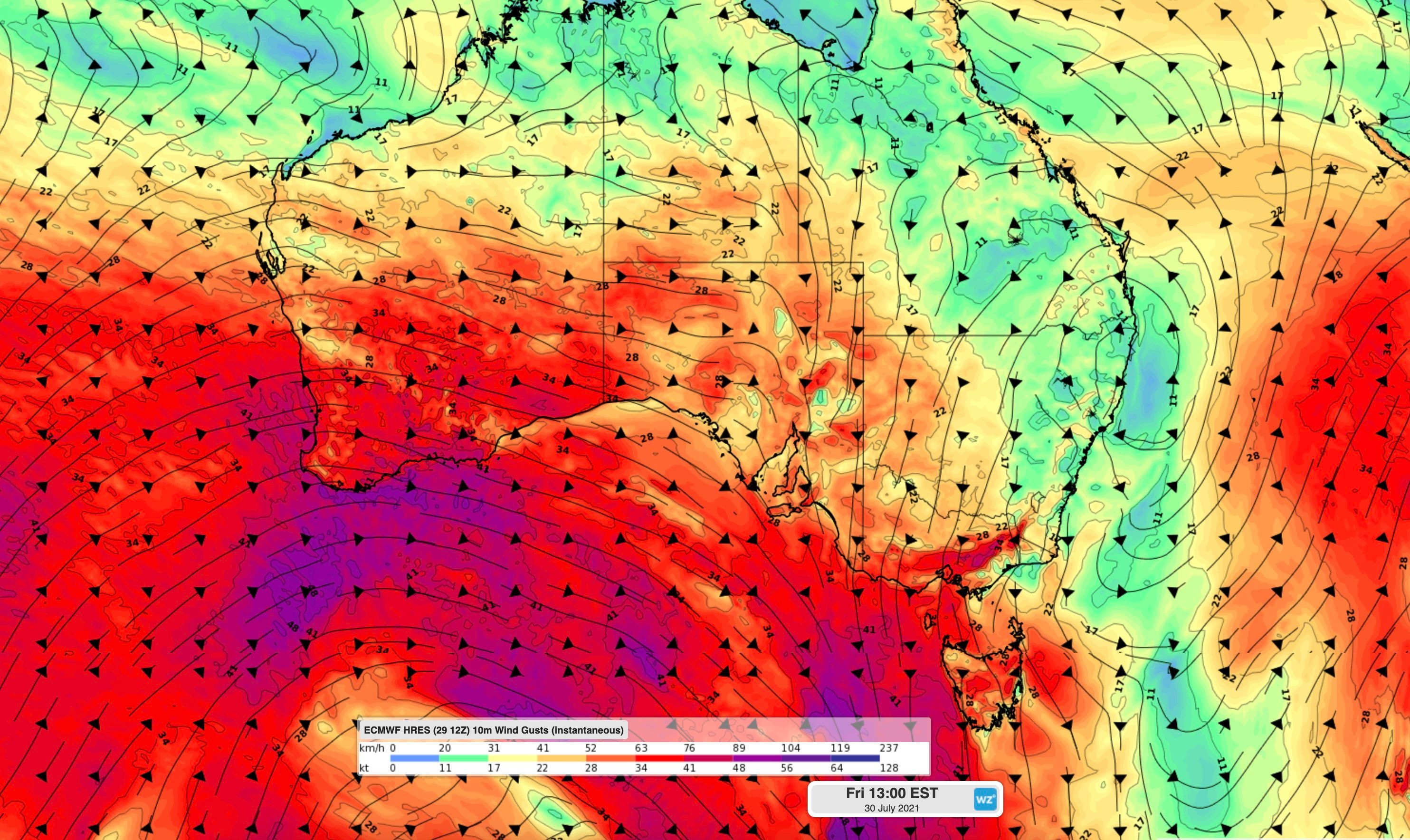 Image: Forecast wind gusts (speed and direction) at 1pm AEST on Friday, according to the ECMWF model.