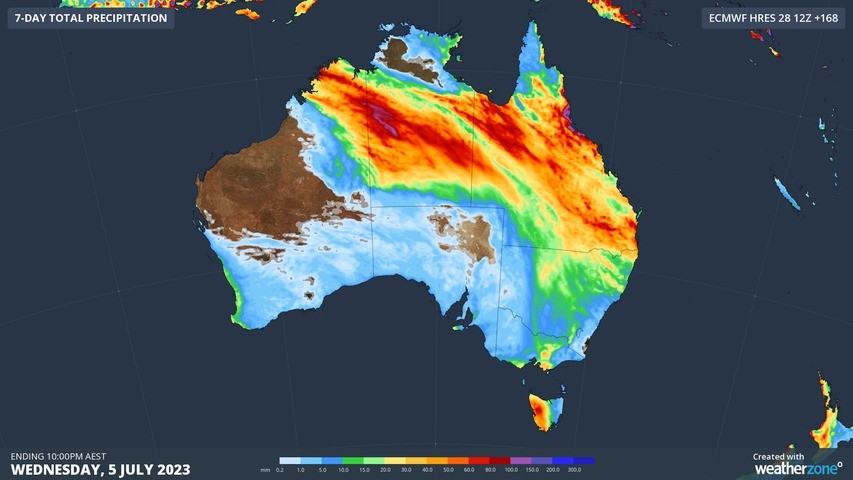 Another pulse of heavier rainfall will develop over WA’s Kimberley and the NT Interior on Friday and Saturday, before spreading further east across Qld from Sunday into early next week. Some forecast models also suggest NSW, Vic, the ACT and even Tas could pick up some rain from this system next week.