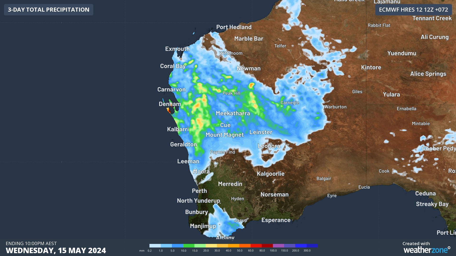 Image: Accumulated rainfall forecast for 3 days leading up to 8pm AWST on Wednesday, May 15.