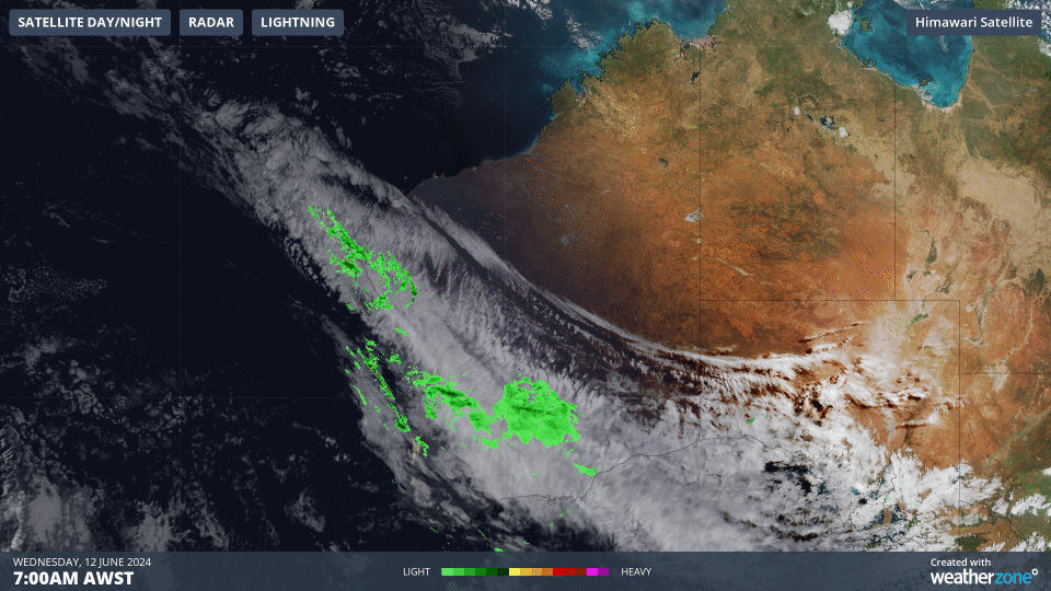 The satellite images below show the northwest cloud band continuing to bring rain to parts of southwest WA on Wednesday morning.