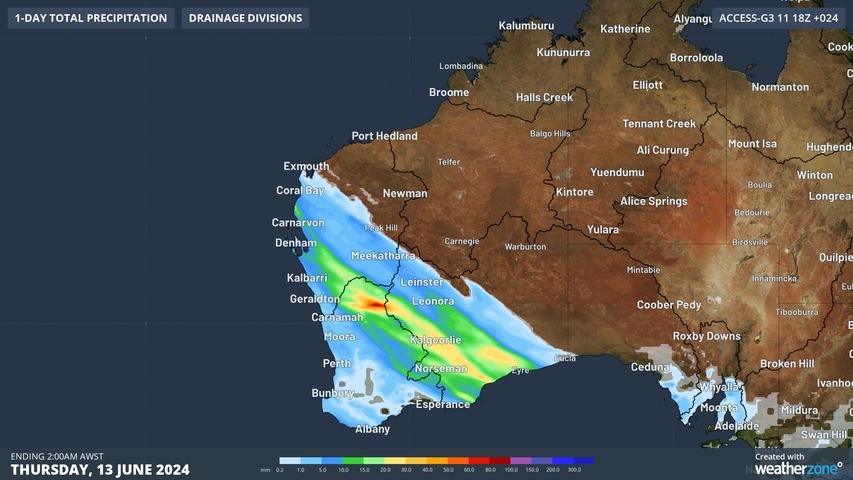 Image: 24 hour accumulated rainfall to 2am AWST on Thursday, June 13, according to Access-G