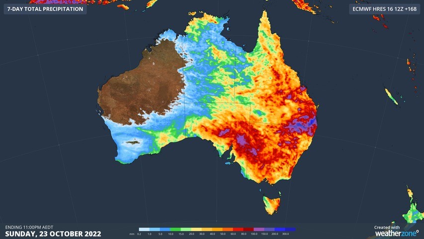 The red shading on the map above shows areas of Australia that are expected to see more than 80 mm of rain this week. The purple blobs could see more than 100 mm, while the blue shading near the QLD-NSW border is where this forecast model anticipates more than 200 mm of rain over the next seven days.