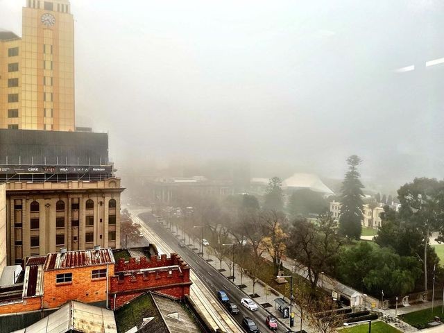 Adelaide was trapped beneath a thick layer of fog and low clouds this morning, reducing visibility and delaying transport across the city.
