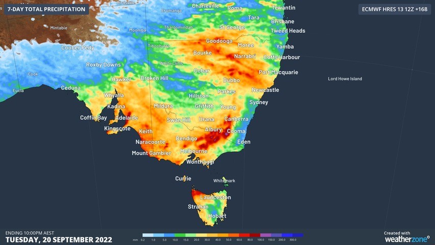 Image: Forecast accumulate rain during the seven days ending at 10pm AEST on Tuesday, September 20.