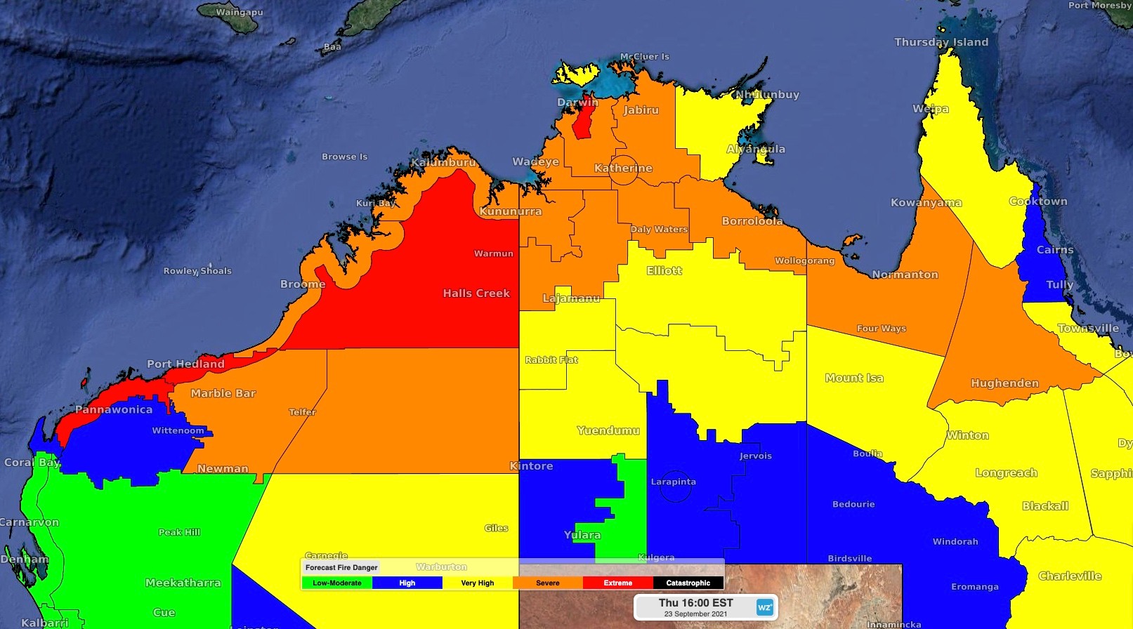 The heat will combine with low relative humidity and blustery winds to cause Severe to Extreme Fire Danger Ratings across most of the Top End on Tuesday.