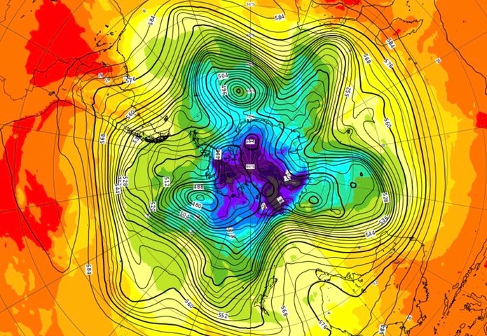 Image: Modelled 500hPa geopotential height and 850hPa temperature over the South Pole on August 1, according to the ECWMF model, showing a meridional pattern with nodes of cold air venturing into the mid-latitudes.