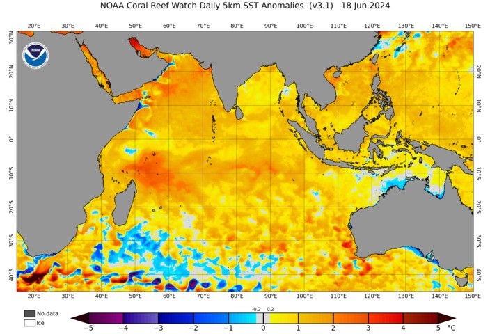 Image: Sea Surface Temperature anomalies on May 19, 2024. Cool waters in the IOD East and warm waters in IOD West indicate a positive IOD pattern developing.