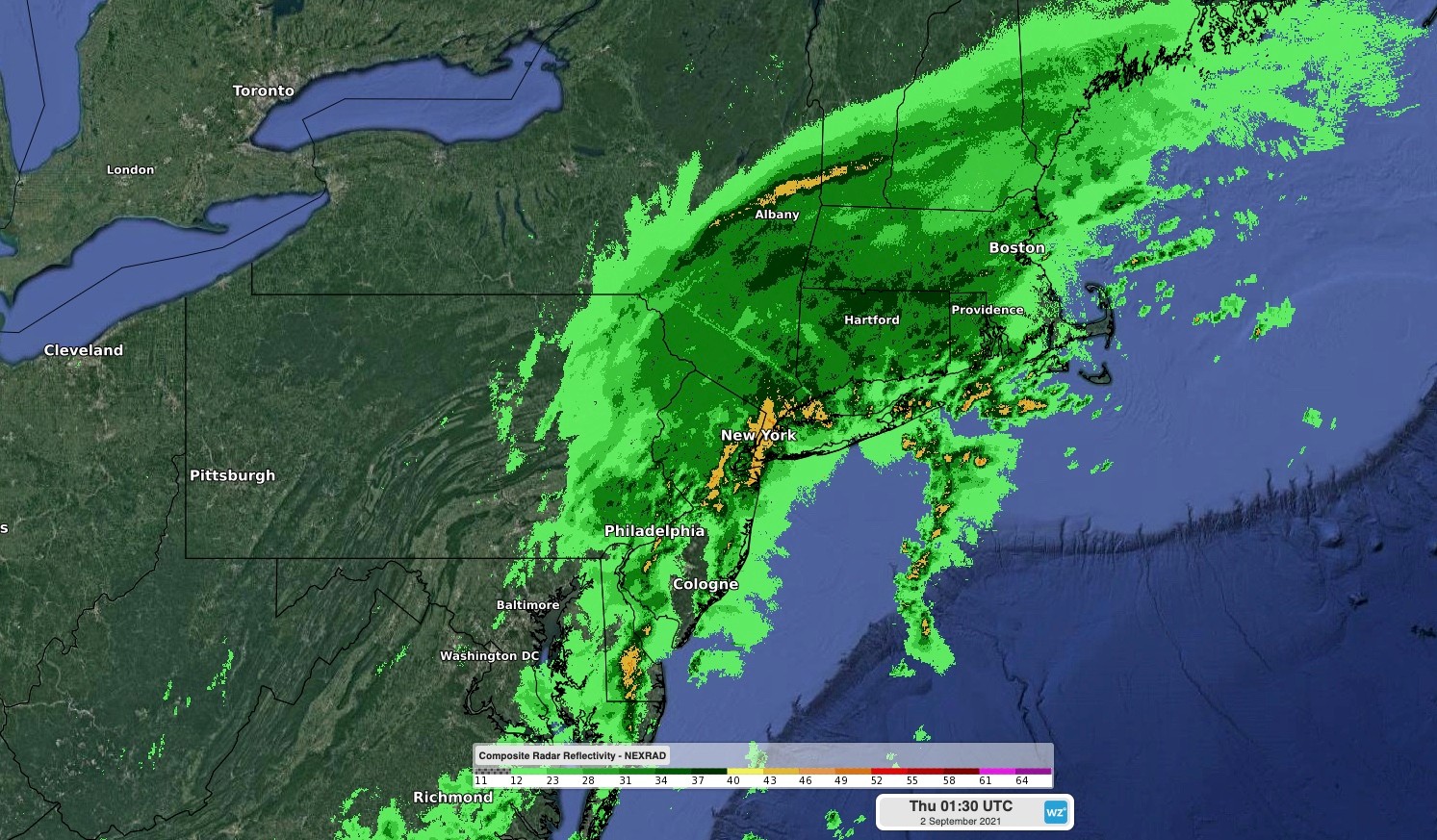Image: Rain over New York and surrounding states on Wednesday night, caused by the remnants of Hurricane Ida.