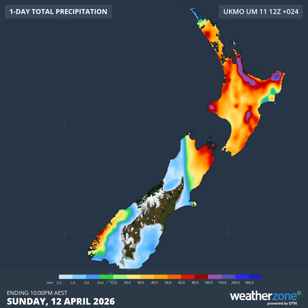 Rainfall has intensified over the North Island and the northern South Island today (Sunday 12th), with rainfall forecasts indication more than 100mm of rain expected over most of the North Island in the next 24 hours, locally up to 250-300mm over Eastland. The New Zealand MetService warns of rainfall rates between 25-40mm/h for eastern areas of the North Island.