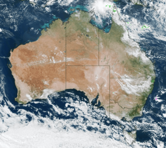 The satellite image below shows that most of Australia is experiencing a sunny Monday morning.