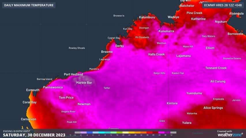 The record for Marble Bar’s highest temperature is 49.3 degrees, set 5 years ago, and while unlikely, there is a small chance that this record is eclipsed on tomorrow. On Sunday and Monday, the hottest area is likely to shift further west with temperatures in Marble Bar dropping back to the low to mid 40s during the first week of 2024.
