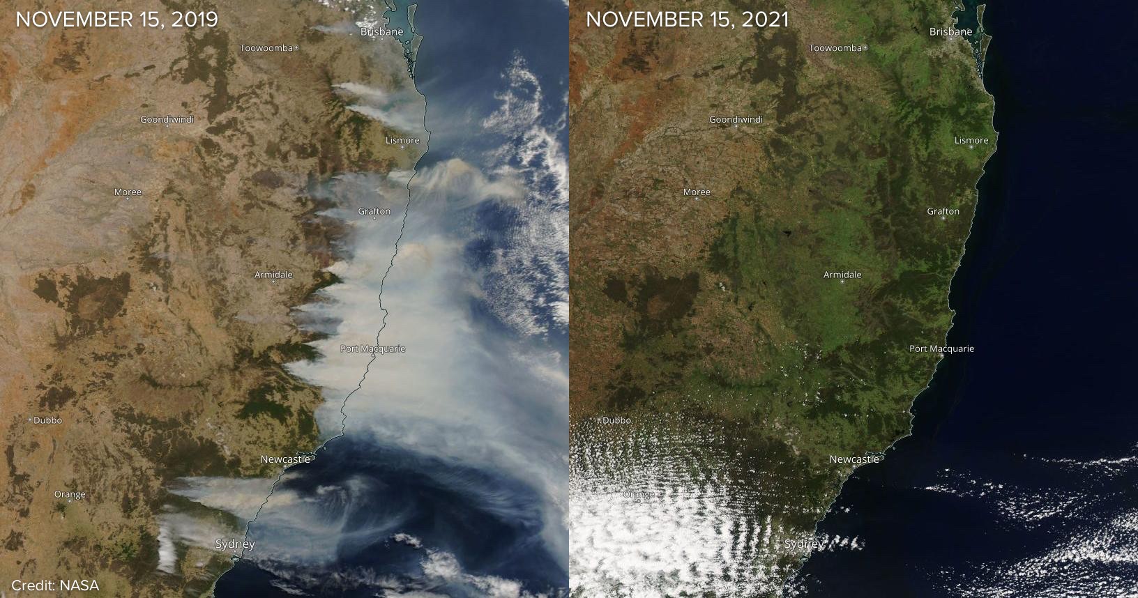 Image: Visible satellite images captured on November 15th in 2019 (left) and 2021 (right). Source: NASA