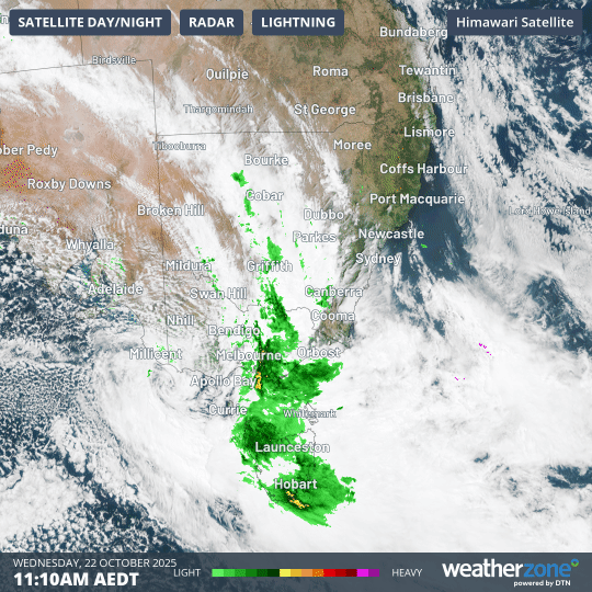 Image: Four-hour combined radar and satellite loop in the late morning and early afternoon of Wednesday, October 22, 2025, over SE Australia.