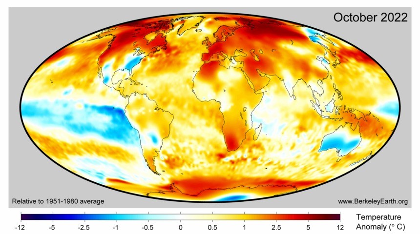 Berkeley Earth’s global temperature data is one of the main international datasets used to monitor our planet’s changing climate. Another highly regarded global dataset from the ECMWF’s Copernicus Climate Change Service also confirms that October 2022 was one of the top four warmest Octobers on record for our planet.
