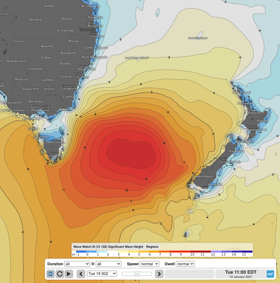 Significant wave height showing a large southerly swell reaching into the Tasman Sea with wave height exceeding 9 meters at its core on Tuesday.