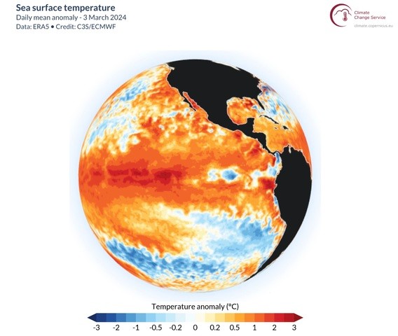 The Pacific Ocean has been in an El Niño phase for the last 6 to 8 months. An El Niño is characterised by a large tongue of warmer-than-average water at the surface of the central and eastern tropical Pacific Ocean, which you can clearly see on the map below from mid-December 2023.