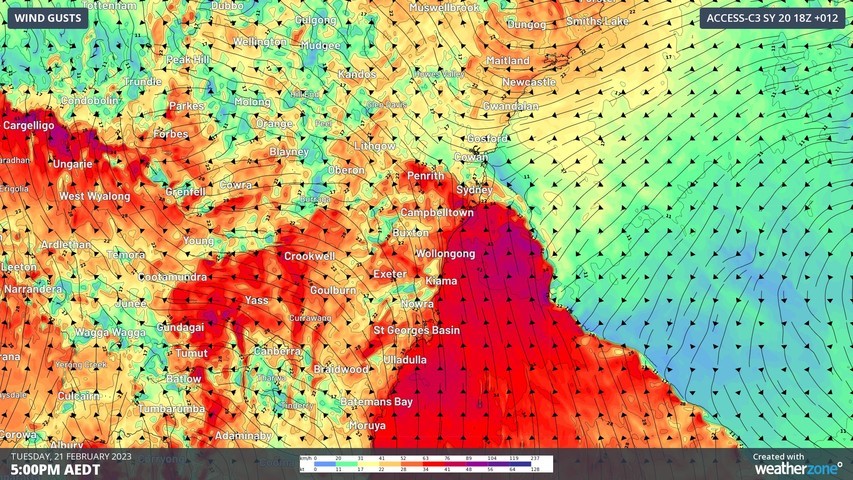 Image: Forecast wind gust speed and direction at 5pm AEDT on Tuesday, according to the ACCESS-C model, showing the strong southerly change near Sydney.