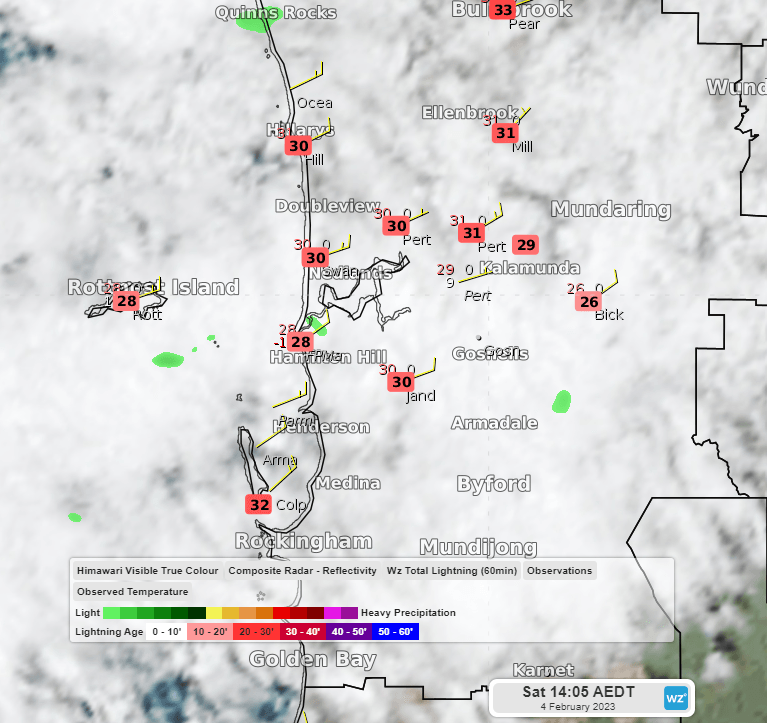 Image: Himawari 8 visible satellite imagery with temperatures at 11:05 AM AWST Saturday 4.