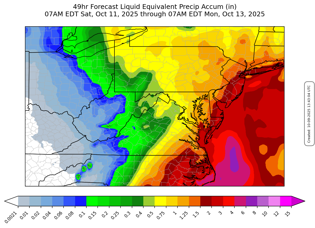 Image: Forecast rainfall across the Mid-Atlantic Saturday morning through Monday morning shows at least 2-3 inches falling across coastal areas. Source: DTN